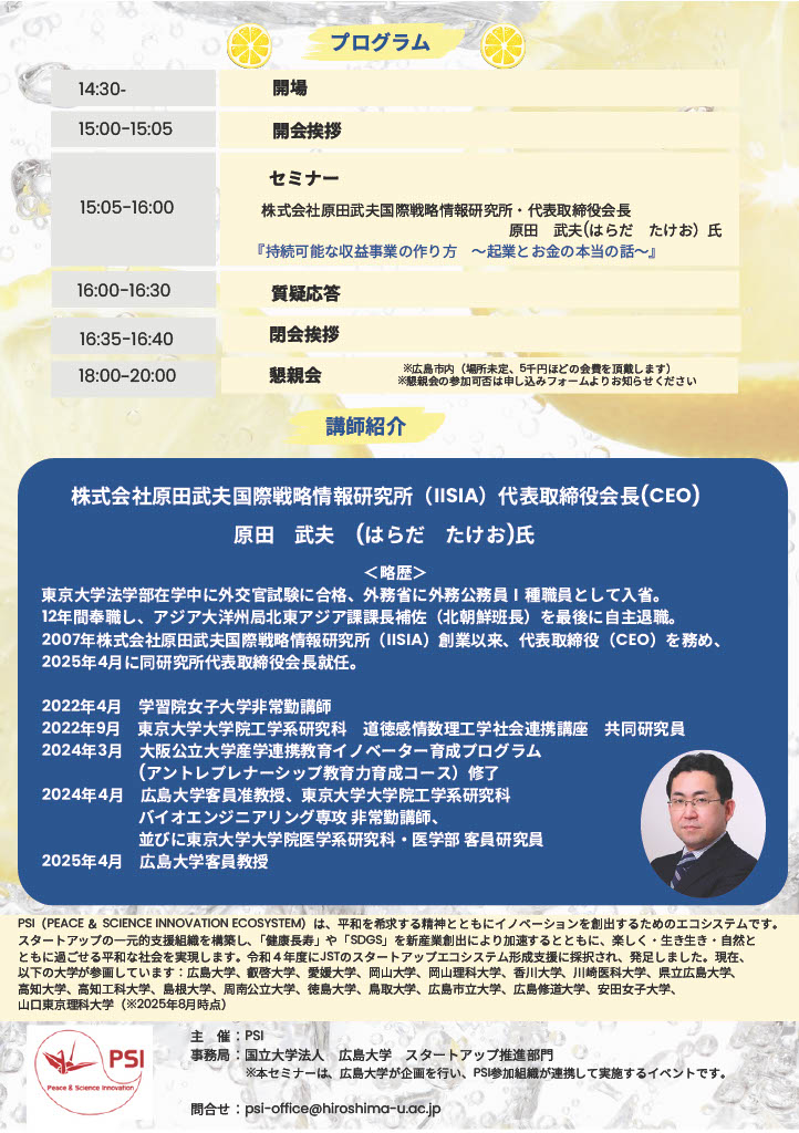 広島大学企画*PSIセミナー『持続可能な収益事業の作り方 ~起業とお金の本当の話~』に講師として招かれました。