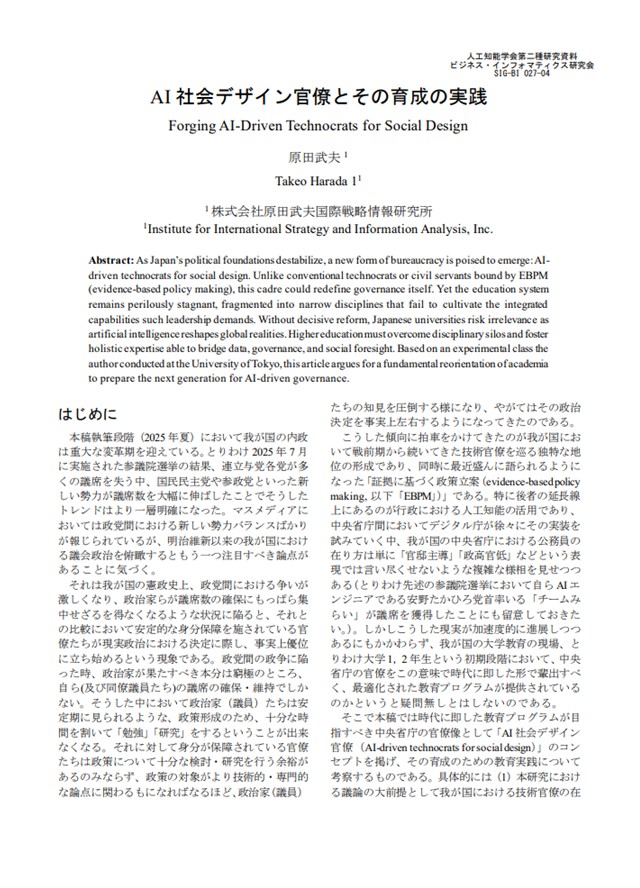 弊研究所 は 27日(土)に開催された一般社団法人人工知能学会・経営課題にAIを! ビジネス・インフォマティクス研究会(SIG-BI)第27回において、「AI社会デザイン官僚(AI-Driven Technocrats for Social Design)」コンセプトを初めて公に提唱致しました。これは弊研究所代表・原田武夫が論文及び研究「AI社会デザイン官僚とその育成の実践」を発表する形で行ったものです。なお、同論文は一般に対しても公開されており、J-Stageサイトから無料でダウンロード・閲覧することが可能です。