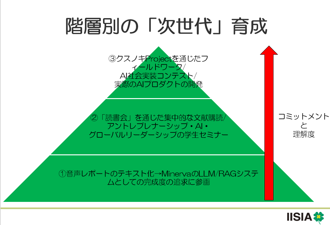 弊研究所では現在、大規模言語モデル(LLM)上にこれまで18年間にわたり対外公表してきた調査分析レポートのデータをベクトル化の上、データベースとして収納しつつ、これを検索拡張生成(RAG)システムによって読み込むことで、これまで積み上げてきた「知の蓄積」をチャットシステムにて平易に利用する仕組みの構築を鋭意行っています。収納されるべきデータには「書かれたテキストデータそのもの」と「音声データをAIでテキスト化したもの」の2種類がありますが、前者については既に前処理の作業が終わっている一方、後者については現在着手したばかりです。膨大な量の音声データを処理する必要がありますが、これをテキストデータとしてRAGシステムに収納することにより、この「システム」がより精緻なアウトプットを出すことが出来る様になります。そこでこの度学生の皆さんにはインターンとして、そのテキスト化に際しての一連の作業に参画してもらい一連のプロセスを加速させることとしました。このインターンを通じて参画する学生の皆さんには、今や必須となっている人工知能(AI)に関する知識と技能について、その社会実装を行っている最先端の職場で体験し、習熟することが出来ます。文字起こしをする対象となっている音声データは実際に、弊研究所がこれまで販売してきたグローバル金融と地政学リスク(グローバル事情)に関する音声レポートであり、AIが文字起こしをしたテキストデータを校閲することを通じて、自ら関連する最先端の知識・見識(大学では学ぶことの出来ない最新のもの)を得ることが出来ます。まずはAIアルゴリズムを用いて指定された音声データを文字起こしさせ、これを校閲するところから仕事を始めてもらいますが、その習熟度や技能に応じて、AIアルゴリズムそのもののコーディングの作業を行っている上級生たちのインターン・チームに参画する機会を得たり、グローバル事情や金融知識、さらにはその背景となっている歴史についてより深く学ぶ学生のための「読書会」に参加する権利を得たり、さらには東京のみならず、大阪など地方においても弊研究所独自の「システム」を用いて人工知能の社会実装について弊研究所の会員を中心とした皆さんに対する啓発活動を行うキャラバン・プロジェクト(「クスノキProject」)のメンバーとして参画するための招待を得たりすることができます。 過日4月19日(土)に開催した「2025年度春・IISIAセミナー」第1部に御来場頂いた皆様には、上記の階層別のインターンシップについて既に会長・原田武夫よりお話させていただきました。その後、今後のインターンシップにおける3階層プログラムは下記のように実施することが決定いたしました。
