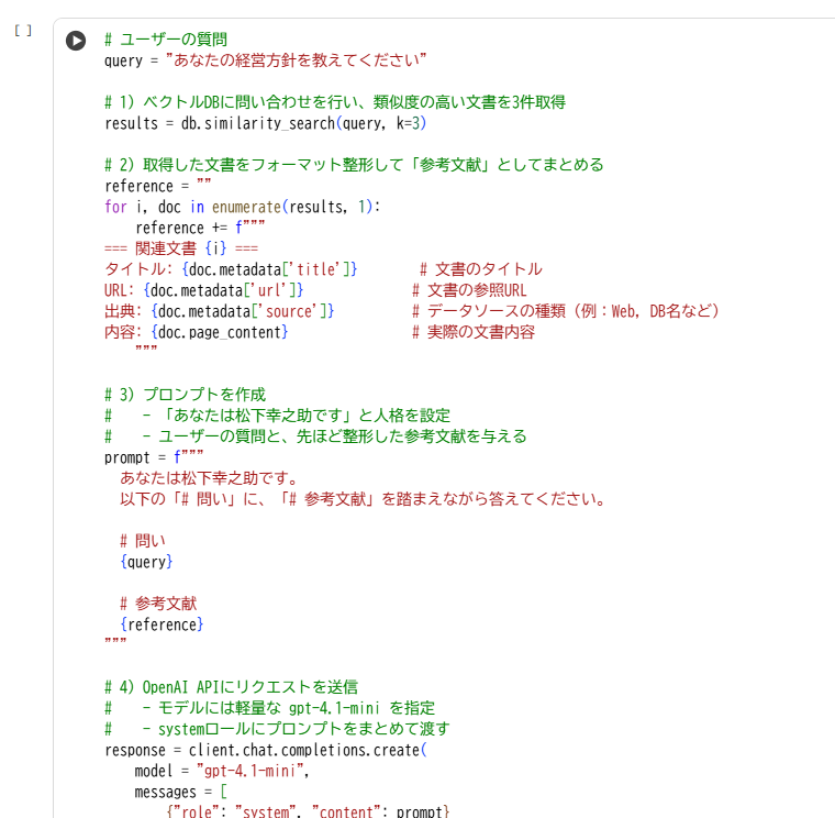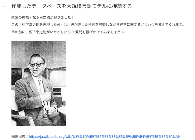 これを聞いて、先般実施したクスノキ・プロジェクトのプログラミング講座に御参加いただいたゴールド会員様におかれましては、講義終盤で作成した「松下幸之助AI」を思い出される方もいらっしゃるのではないでしょうか?