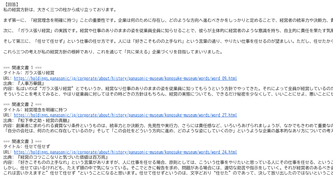 ワークショップでは、同氏の名言集などを基に「経営の神様・松下幸之助」を再現した検索拡張生成(RAG)システムを構築し、作成したデータ・ベースを大規模言語モデルに接続し、経営のノウハウを受け取るという体験をしていただきました。