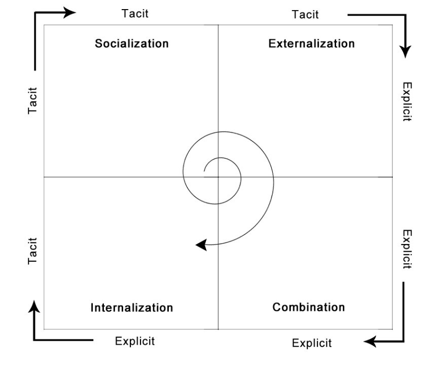 「視える化」と一口に言っても、その意味はさまざまです。単にデータを残すことと、後から参照し判断に活用できる状態にすることは同じではありません。事業承継においては、後者の視点からもう少し構造的に捉える必要があります。この点を考える際に有効なのが、野中郁二郎氏のSECIモデルです。