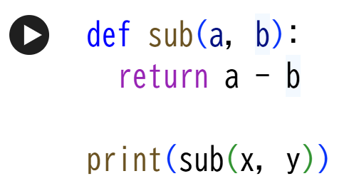 先ほど用意した変数x, yを使って、関数を組んでみましょう。関数とは、ある処理をひとまとまりにして名前を付け、必要な時に呼び出せるようにしたものです。下のコードでは、引き算の処理にsubという名前をつけて関数にしています。a, bには任意の数値を代入することができます。