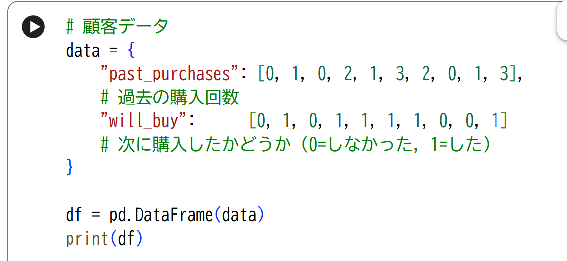 「過去の購入回数から、次にその顧客が購入するかどうかを予測する」という問題です。
